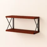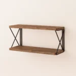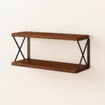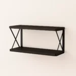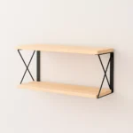 Ménsula doble de hierro forjado industrial color negro satinado con dos estantes de madera maciza resistente, robusta y duradera, para colocar en tu cocina, living o habitación.