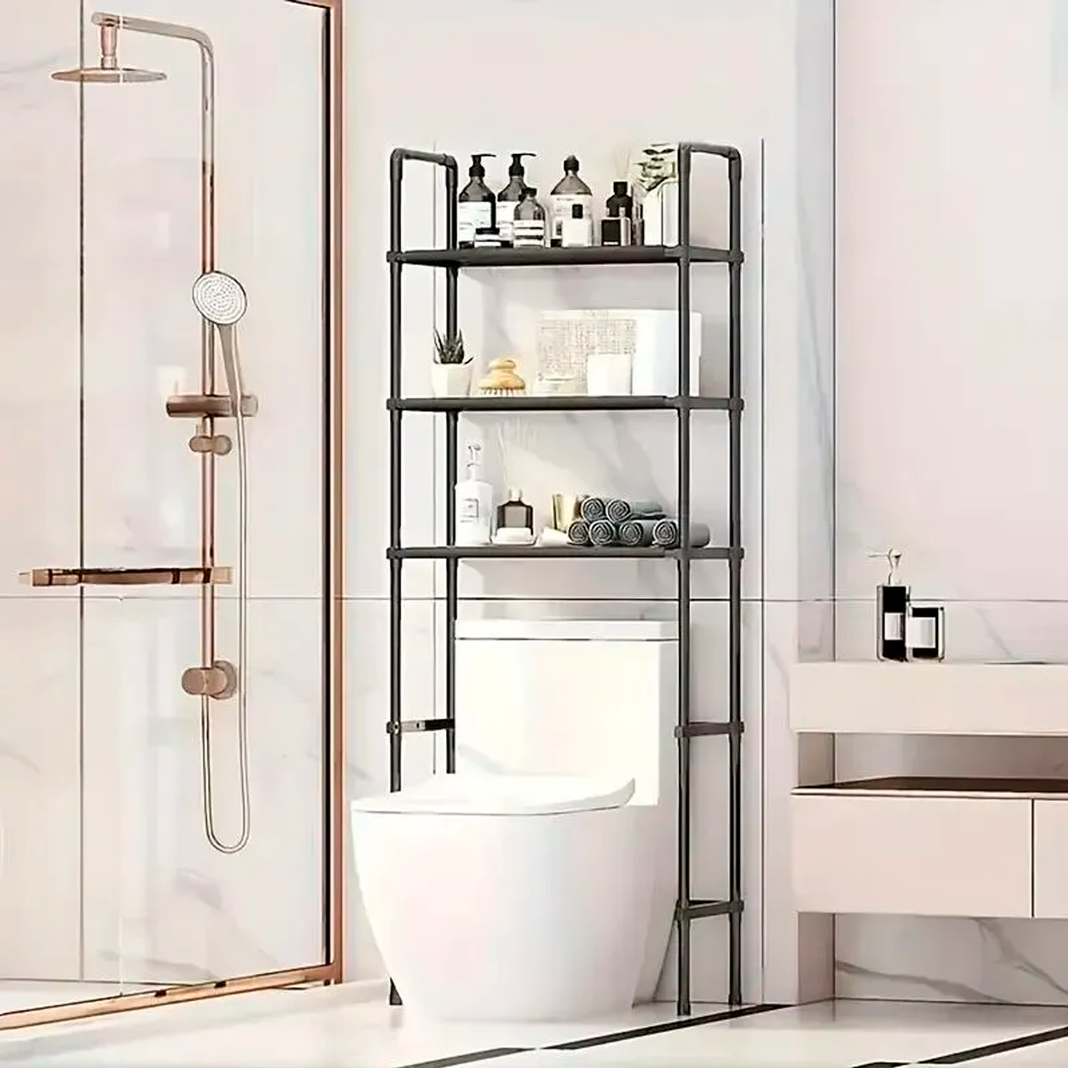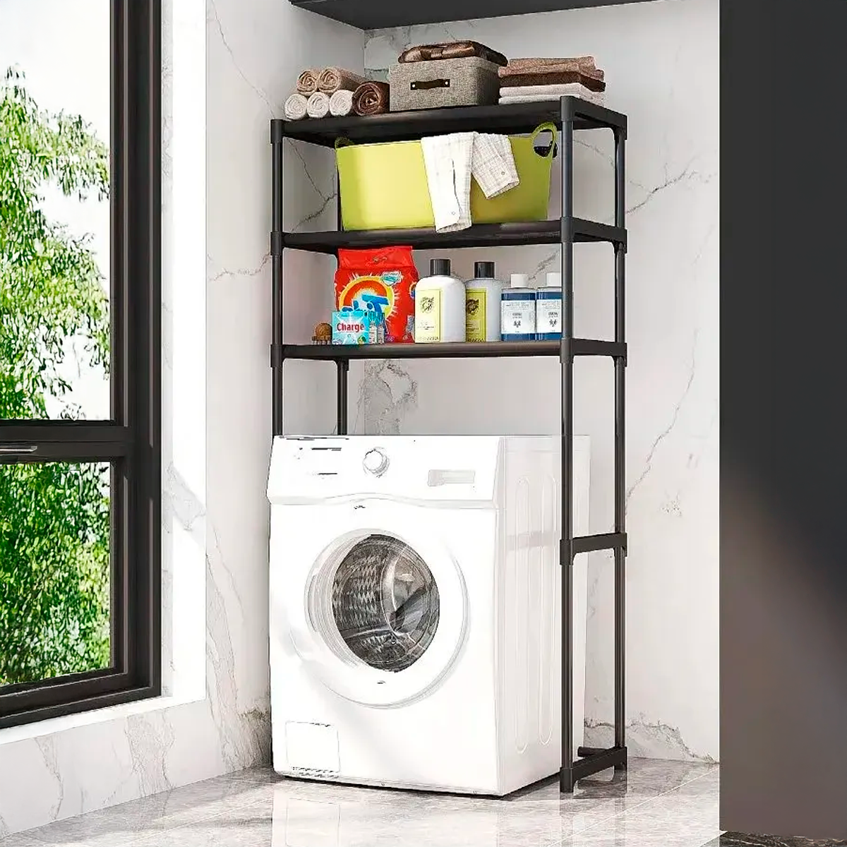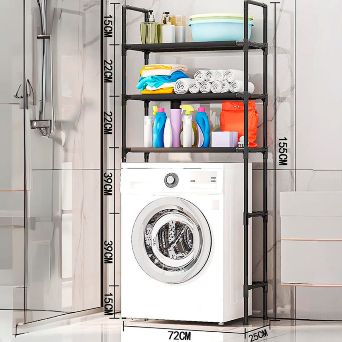 Organizador Metálico para Lavarropas y Baño HELITEC, con 3 Niveles Optimizá el espacio de tu hogar con este práctico estante organizador metálico de 3 niveles, diseñado para colocar sobre el lavarropas o en el baño.
