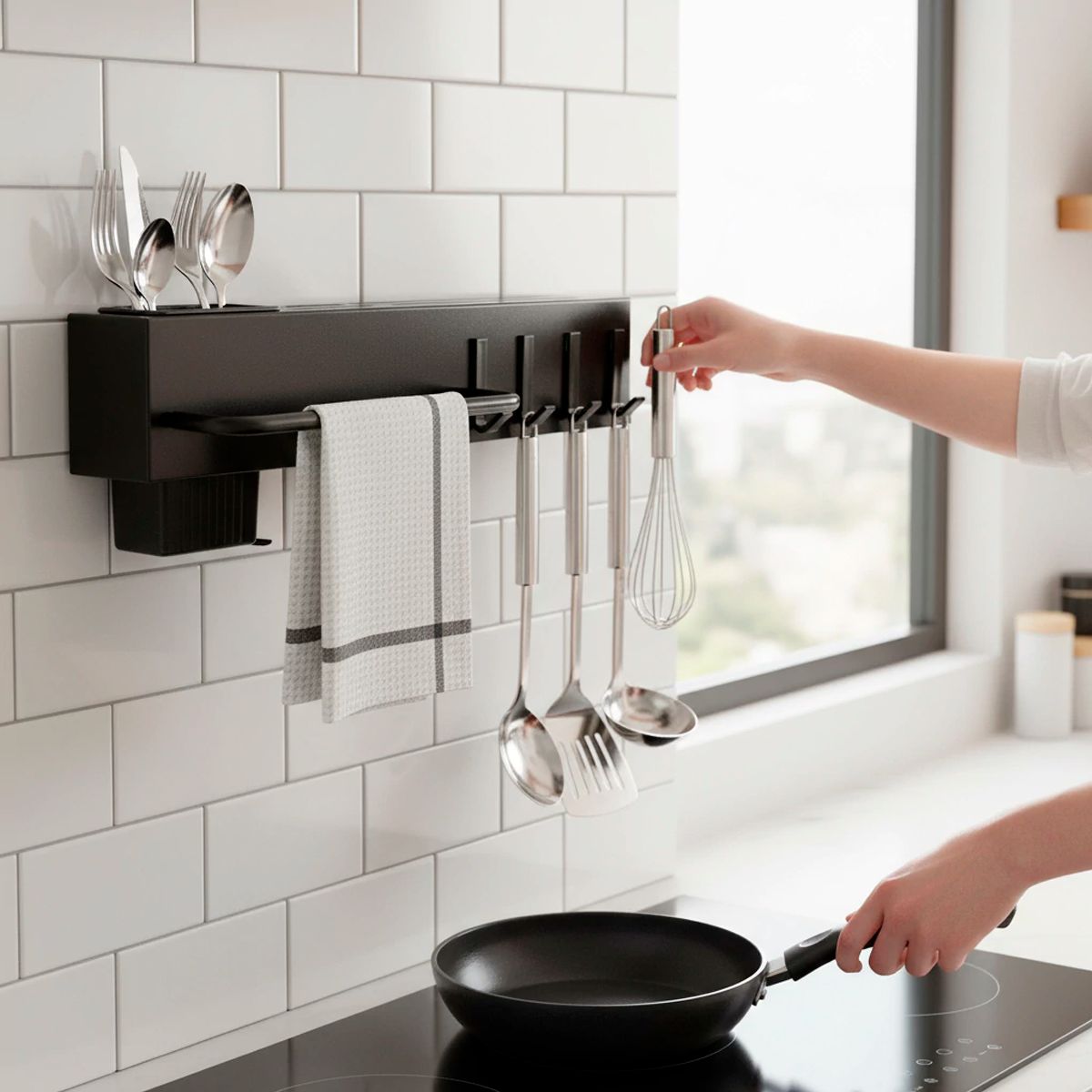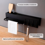 Funciones: incluye 4 ganchos para colgar utensilios, barra para paños y compartimiento superior para cubiertos o accesorios pequeños