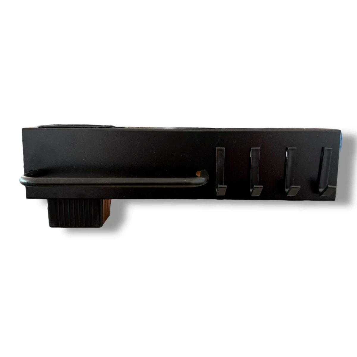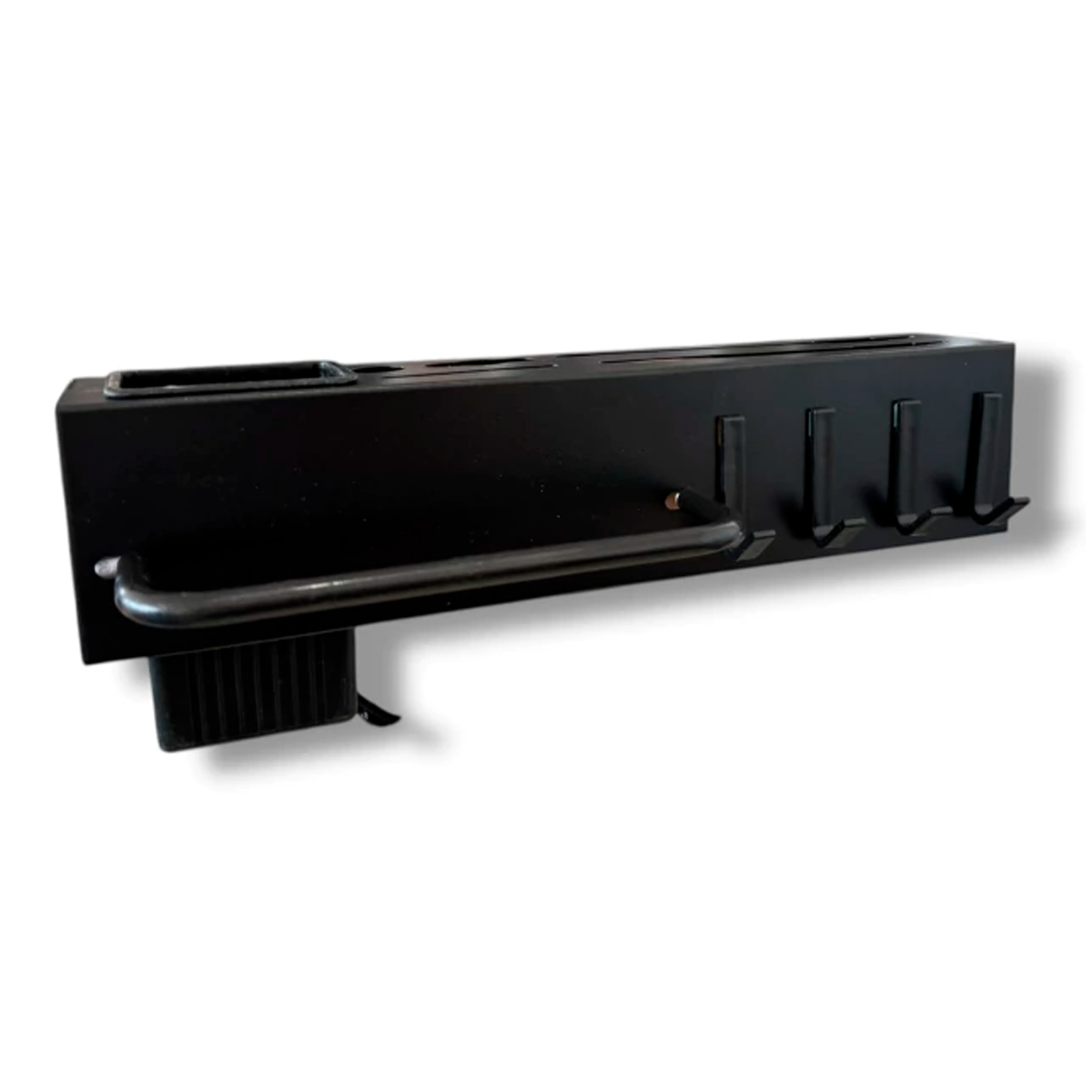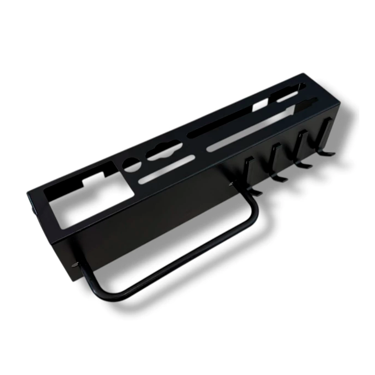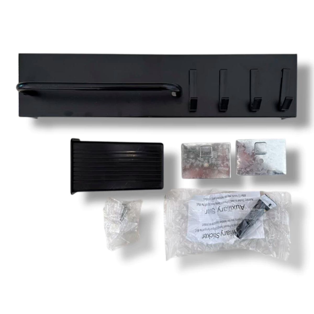 Contenido del empaque: estante metálico, soporte de montaje, 4 ganchos plásticos, tornillería y accesorios de fijación